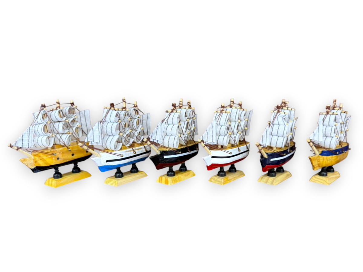 Pequeño barco carabela de madera disponible en 6 colores diferentes el Pack es de 12 e incluye 2 por color .